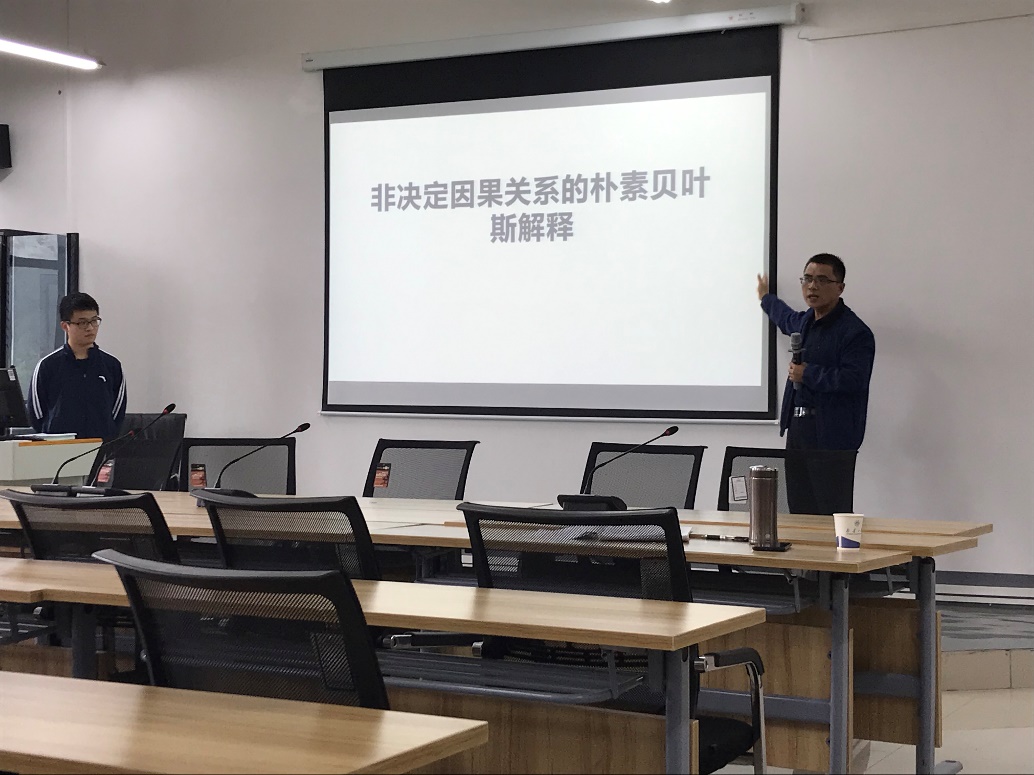 景海龙作了题为《非决定因果关系的朴素贝叶斯解释》的报告。他指出自休谟以来,因果关系一直是哲学研究的重要问题,而休谟的因果解释中存在着大量的非因果性内容,赖欣巴哈和刘易斯试图从不同的视角完善和发展休谟的因果关系理论,但是都面临一些困境,因而此次分享的重点就在于解释和总结二者的困境,并提出解决此困境的创新性路径。为此,他从九个方面进行了具体介绍。首先,他从因果关系是怎样的一个哲学问题、为什么要讨论因果关系等方面入手,从宏观角度引入要探究的主题;进而从理论层面着重分析了赖欣巴哈和刘易斯的因果关系理论并对二者存在的问题进行具体探析与深度总结,最后针对存在的问题提出了他的创新性解决途径,即基于二者因果关系的理论内涵,可以在贝叶斯主义的主观概率理论下将因果关系视为一个连续的概率显现过程,区分出因果关系效应的三个层次:背景、情景、结果,从而构建非决定因果关系的解释系统,统一传递性特征与可能性特征。考虑到听众可能会因为对因果关系相关理论不够熟悉而在听取报告中产生诸多疑惑,景海龙在进行报告时穿插了许多图例解析,并结合实际举了大量现实案例,既丰富了报告内容又极大地促进了同学们的理解。