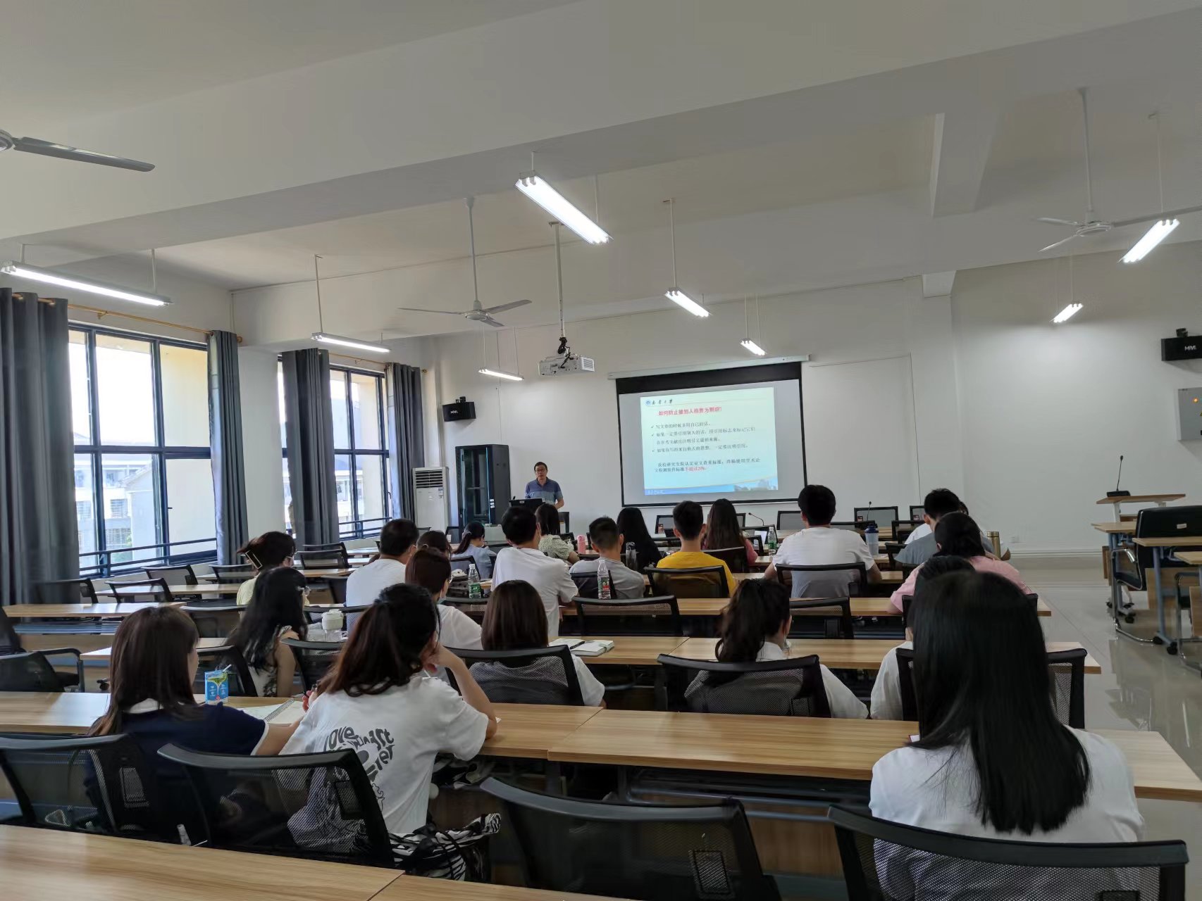 邹海贵首先解释了学术道德与学术规范的内涵,强调研究应守住“良心”,把握“基点”。接着分析了研究生需要学术道德的重要性,并从正反两面加以举例分析。随后,邹教授进一步讲解了学术腐败、学术不端、学术失范等学术道德失范行为的表现、原因及处理办法。最后,邹教授指导同学们如何提升学术道德与规范,并结合自身经验向大家传授了如何以科学的方式吸收借鉴前人研究成果。讲座深入浅出,从学术规范角度为新研究生们的学术生涯上了精彩一课。