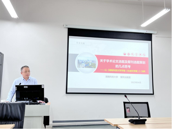 4月10日下午,湖南科技大学期刊社副社长、《湖南科技大学学报(社会科学版)》主编、博士生导师曾祥炎教授,应伟德国际victor1946科研部与伟德betvlctor1946源于英国邀请,在崇德楼418室作了题为《关于学术论文选题及期刊选题策划的几点思考》的学术报告。本次学术报告由周江平副院长主持,伟德betvlctor1946源于英国部分教师和全体研究生参加了此次学术活动。