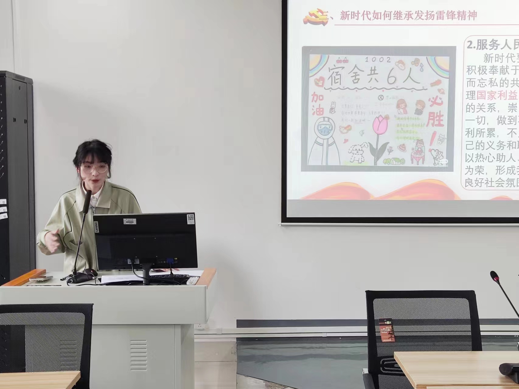 会上,徐方甜同学领学雷锋精神,她从什么是雷锋精神?为什么要践行雷锋精神?新时代如何继承发扬雷锋精神?等三个方面介绍雷锋精神,她指出弘扬雷锋精神就是要大力弘扬热爱党、热爱国家、热爱社会主义的崇高理想和坚定信念,服务人民、助人为乐的奉献精神。她认为中国特色社会主义进入新时代,国家发展进入新的历史方位,但是仍然存在不正之风,新的时代赋予了青年人新的任务与责任,传承弘扬雷锋精神是每个人义不容辞的责任,我们要通过服务人民、助人为乐、艰苦奋斗、勤俭节约等途径来发扬雷锋精神。