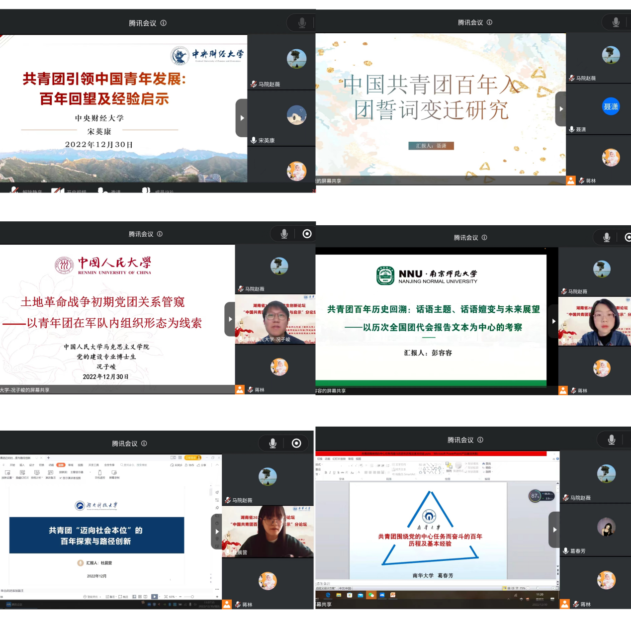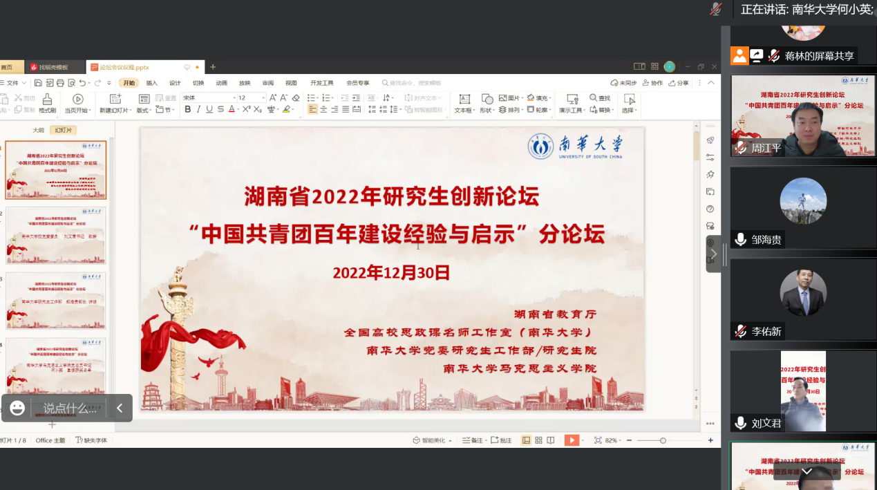 12月30日上午,我校成功召开湖南省2022年研究生创新论坛——“中国共青团百年建设经验与启示” 分论坛研讨会。伟德国际victor1946校党委委员刘文君、伟德国际victor1946研究生工作部部长邹海贵出席会议并致辞,伟德betvlctor1946源于英国党总支书记何小英教授、党总支副书记张峰林教授、副院长周江平副教授分别主持了三个阶段的议程,学术委员会主席肖宗志教授作了学术交流阶段点评。会议特邀教育部“长江学者”特聘教授、湘潭大学教育部人文社科重点研究基地毛泽东思想研究中心主任李佑新教授作题为《青年毛泽东的“自我实现”》的学术讲座,并邀请了六位论文一等奖获得者作获奖代表交流发言。全国多所高校研究生共计百余人参与了此次线上会议。