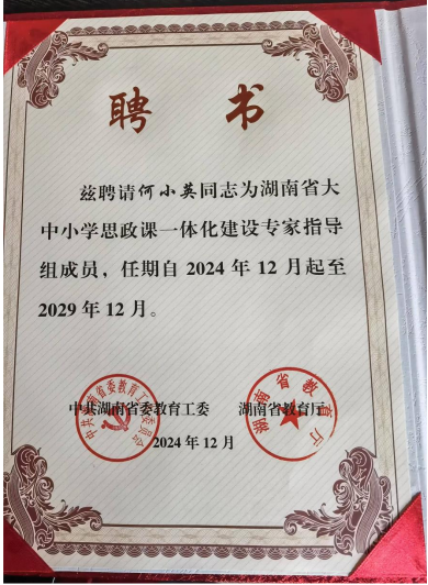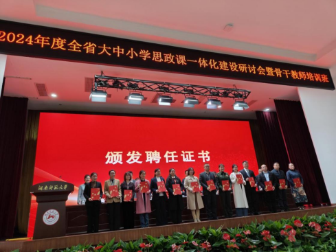 会议举行了湖南省大中小学思政课一体化建设专家指导组成立大会,宣布了湖南省大中小学思政课一体化建设专家指导委员会43位专家名单,并颁发聘任证书,我院党委书记何小英教授获聘为该专家指导组成员。