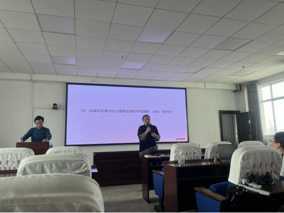 刘文君以习近平总书记在二十大报告中关于祖国统一的一段视频作为引子, “解决台湾问题是中国人自己的事,要由中国人来决定”,特别引起大家的共鸣。他首先引用相关文献回顾了“台湾自古属于中国”的历史和事实,又借助漫画视频生动而形象地展示了台湾与祖国之间的关系变迁。接着,他从实现祖国完全统一是中华民族伟大复兴的必然要求、国家发展引领两岸关系发展方向、“台独”分裂势力抗拒统一不会得逞、外部势力阻碍中国完全统一必遭失败等四个方面揭示了“不可阻挡的统一大势”。最后,他指出了在处理台湾问题上“与时俱进的行动纲领”,要坚持“和平统一、一国两制”的基本方针,坚持推动两岸关系和平发展和融合发展,坚决粉碎“台独”分裂和外部势力干涉,团结台湾同胞共圆中国梦。在报告结尾时又引用习近平总书记在二十大报告中“祖国完全统一的历史任务一定要实现,也一定能够实现”,展现出对祖国统一大业的坚定信心。