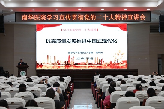 何小英书记以高质量发展推进中国式现代化为主题从“中国式现代化建设的背景与国际环境”、“中国式现代化的特征、本质要求与战略安排”、“高质量发展的内涵、目标与重点”、“以高质量发展推进中国式现代化”等四个方面深入浅出、系统全面的介绍了高质量发展及中国式现代化的内涵,并结合医院近几年发展的实际,为参会人员深刻领会和准确把握党的二十大精神实质和全面抓好党的二十大精神的落实落地指明了方向。通过宣讲,大家明确了只有高质量发展才能推动中国式现代化,只有中国式现代化才能全面推进中华民族伟大复兴。整场宣讲报告系统全面、重点突出,条理清晰、严谨生动,鼓舞人心,既有理论高度,又有实践深度,对全院上下学习好、宣传好、贯彻好、落实好党的二十大精神,具有十分重要的指导意义。