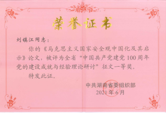经过省委组织部组织专家对收到的论文进行认真评审,我院刘镇江教授的文章《马克思主义国家安全观中国化及其启示》喜获一等奖,一等奖全省共5篇。