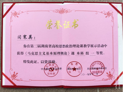 从教学科研来看:闫寒英老师全年完成四个班的本科生教学任务和一门研究生课程,教学效果突出,受到学生敬爱;在申报职称听课中,校五位教学督导一致给予高度评价。她致力于教学改革,2019年在国家级刊物发表2篇高质量教研论文。为把理论应用于实践,她还积极参加教学比赛,2019年11月30日,在第二届湖南省高校思想政治理论课教学展示活动中,过关斩将,荣获全省一等奖。这个大奖的获得,是伟德betvlctor1946源于英国高度重视,精心组织的结果,也是闫寒英老师胸怀为伟德国际victor1946争取荣誉的赤子之心,认真准备,积极付出的结果。2020年度获评伟德国际victor1946“十佳优秀教师”。2021年12月,指导学生获得湖南省第七届大学生思想政治理论课研究性学习成果展示一等奖。